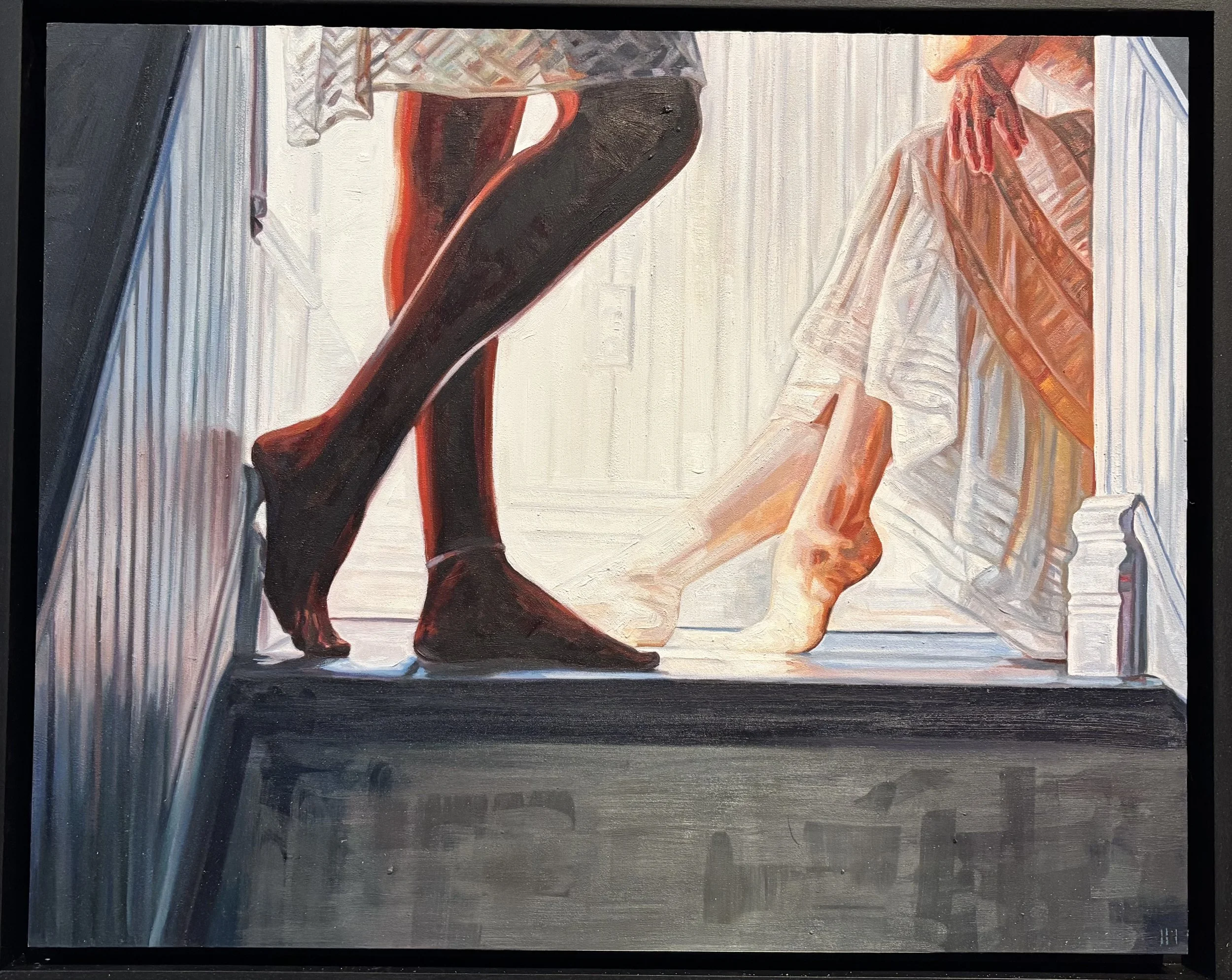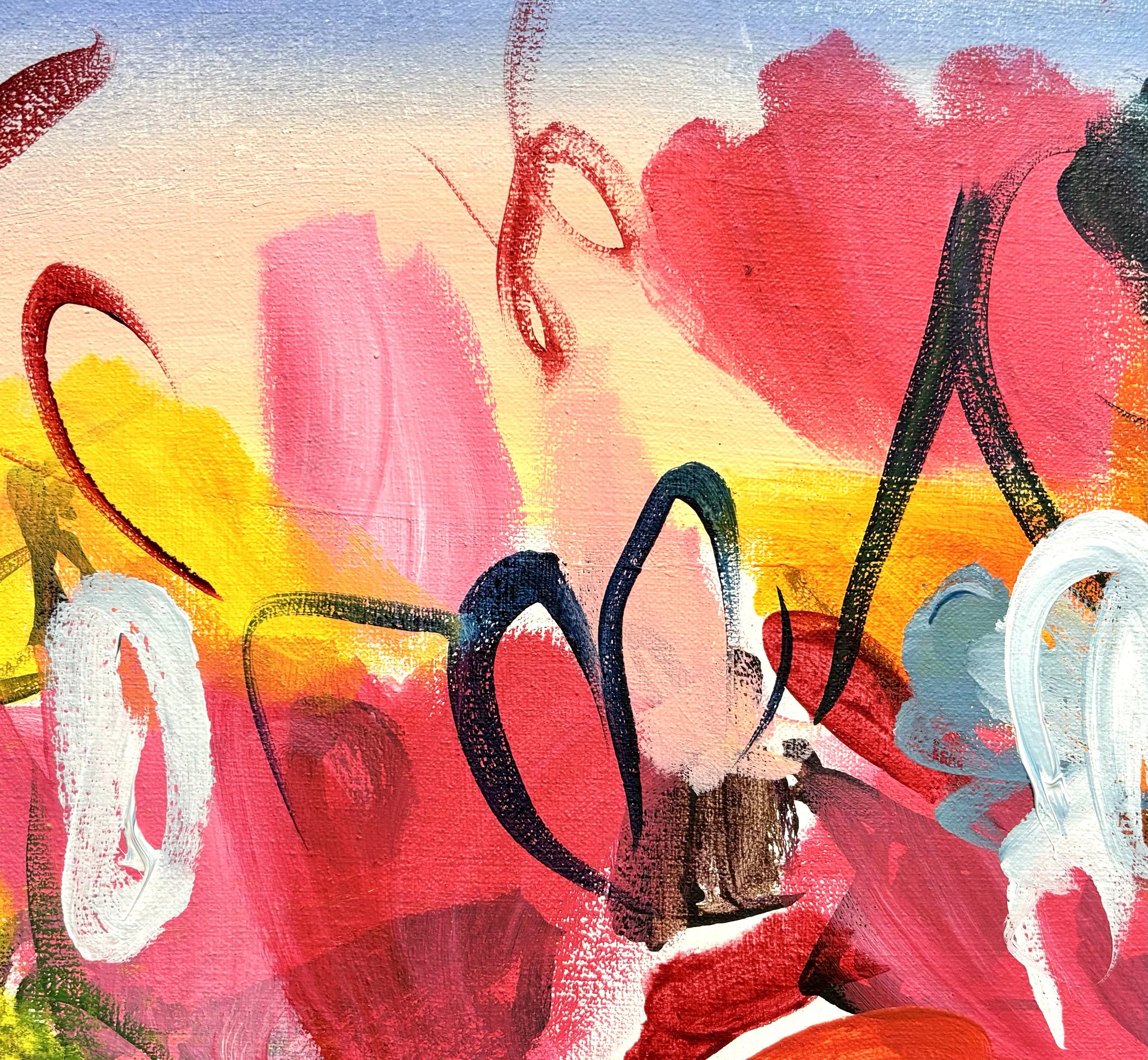 A mark of dark red comes from the top center and makes two loops. Loops can look too doodly, but at the beginning of a painting I leave them be. What is great about this looped mark is its relation to the rest of the forms and space, as well as its dry brushed rough edges.