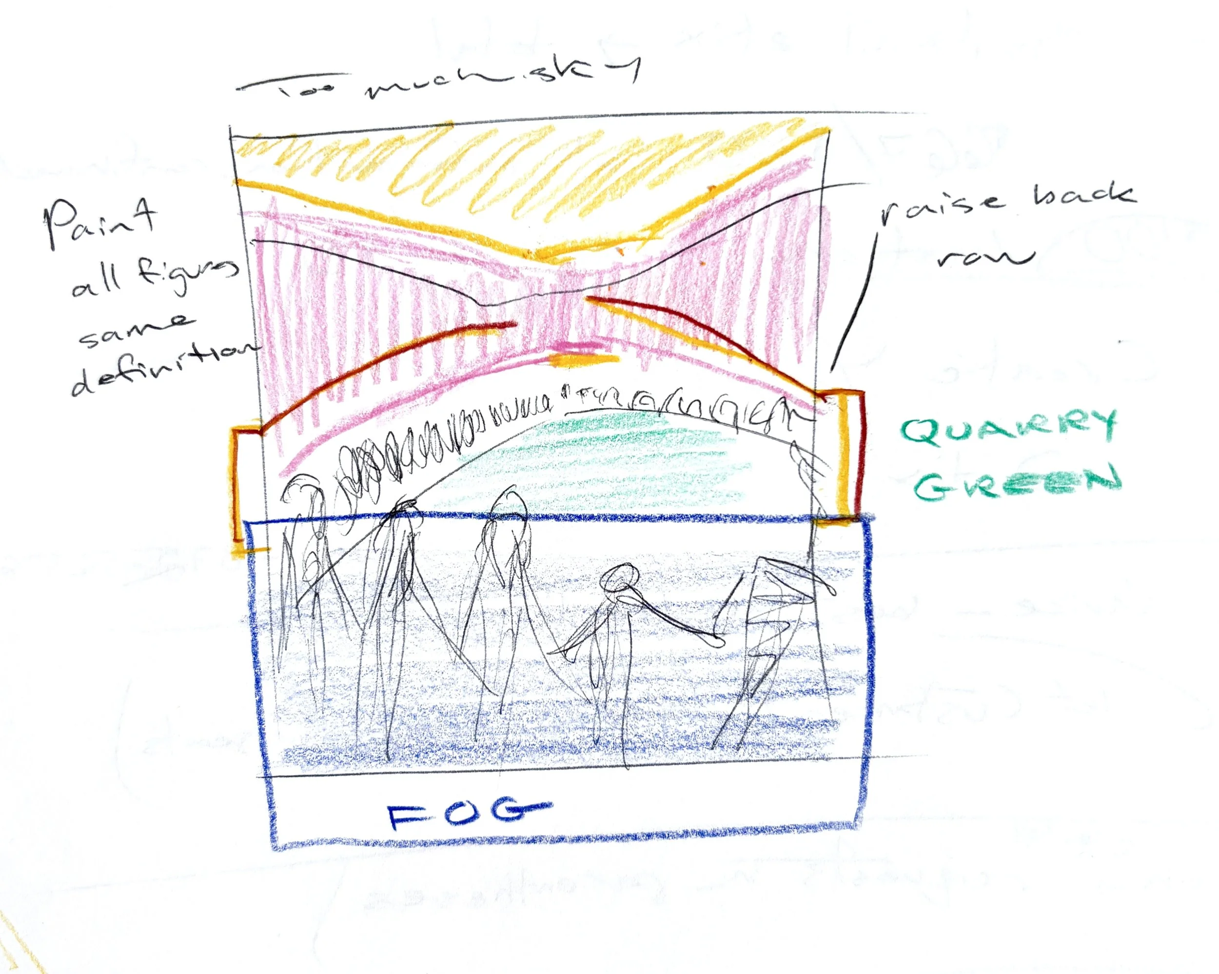 For a painting in early stage. The first note is that there is too much sky and to lift the horizon. The next note is to shift the hillside base in accordance. The people along the quarry’s edge must rise as well and create a greater arc. Next of note is to make the quarry green. With the top of the composition shifted, the bottom has a note to make the figures taller and alter their height line. A box labeled “fog” encapsulates the lower third of the scene. Lastly, there is a note to paint every person as defined as the rest, the further figures the same as those in the foreground.